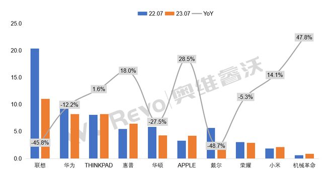 不久前捷孚凯市场咨询(中国)有限公司(简称 GFK)发布了 2023 年 7 月份笔记本零售市场报告。报告显示,2023 年 7 月份,中国大陆笔记本电脑零售市场季度销量同比下降 10%,环比下降 37%。