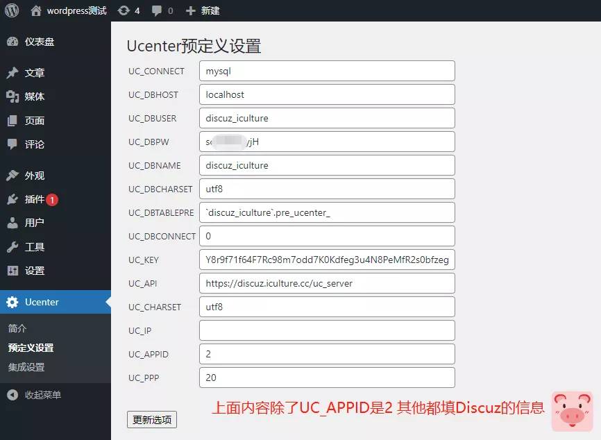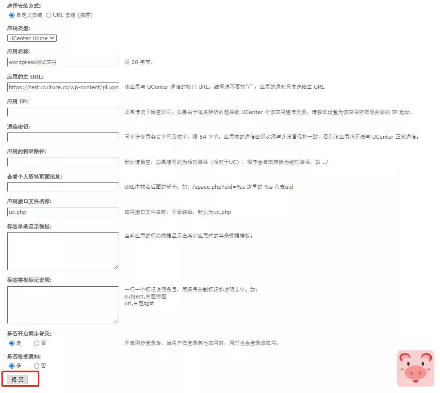 https://test.iculture.cc/wp-content/plugins/ucenter-integration填写链接格式,这里默认您已经配置好https了,如果没配置就用http开头,格式https://您的域名/wp-content/plugins/ucenter-integration