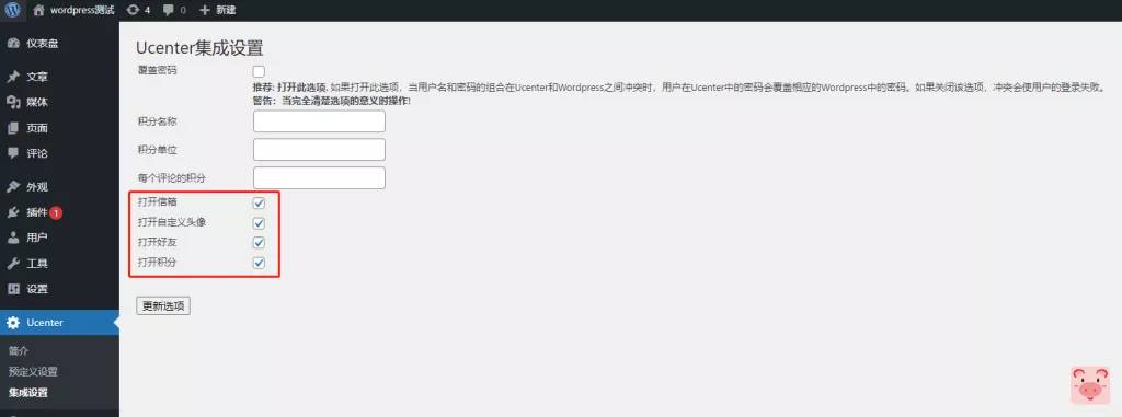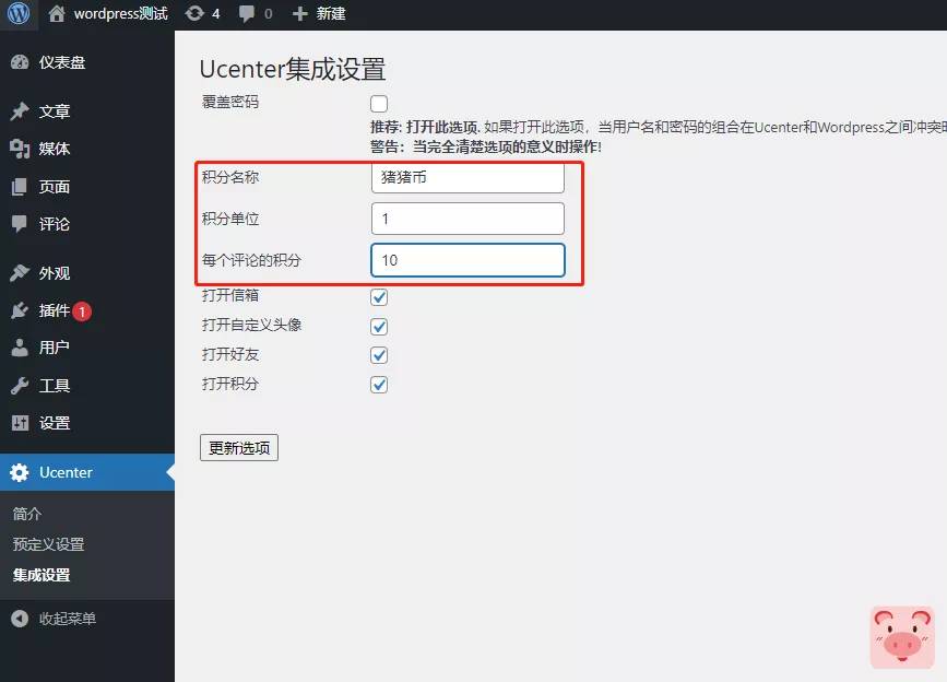 我们可以在Wordpress里接入积分,我这里命名为猪猪币,积分单位填1,每个评论的积分为10(你们自己的积分策略可以按需填写)
