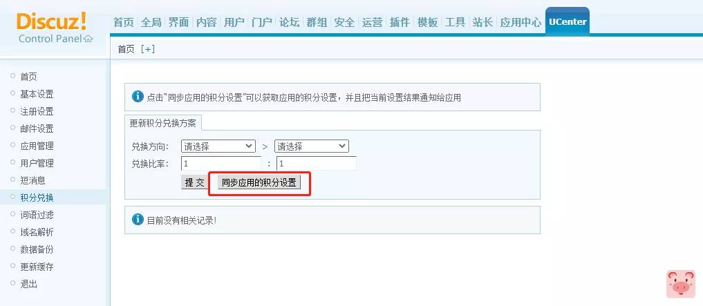 然后回到Discuz Ucenter中心,点击同步应用的积分设置