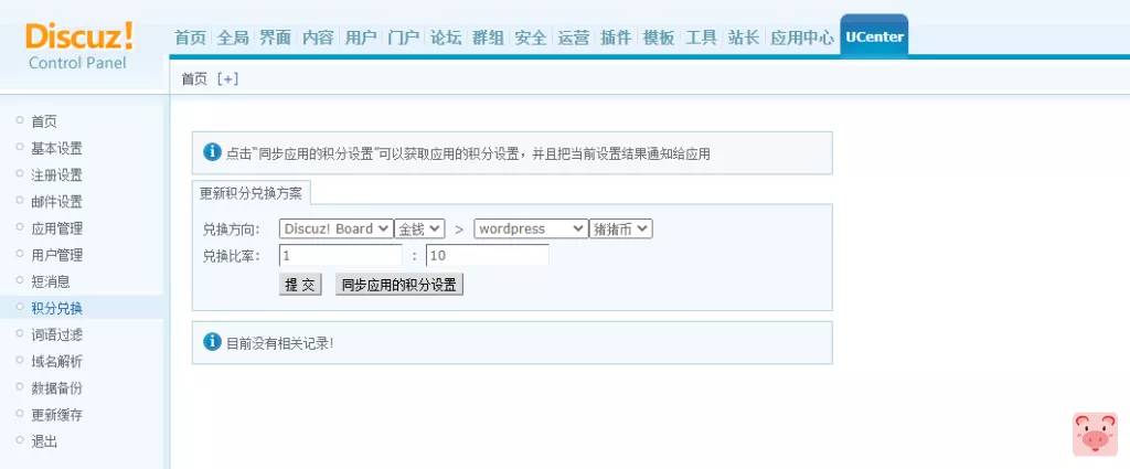 比方说我们把之前Discuz! Board论坛的金钱换成wordpress中的猪猪币(1:10兑换)