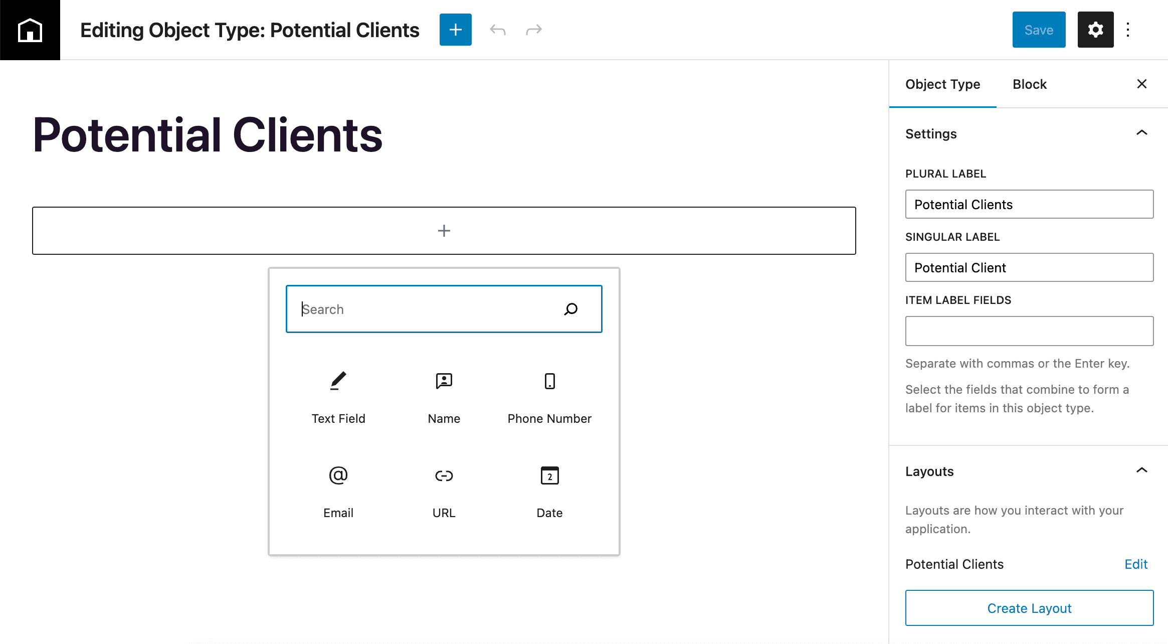 编辑对象类型看起来与 WordPress 块编辑器非常相似。应用程序创建者可以轻松添加将成为该对象一部分的字段,并拖放以重新排列它们。用户可以创建对象类型之间的关系,以智能方式组织应用程序的数据。Engine Awesome 还设置为通过 Zapier 集成将应用程序连接到 5,000 多项服务。