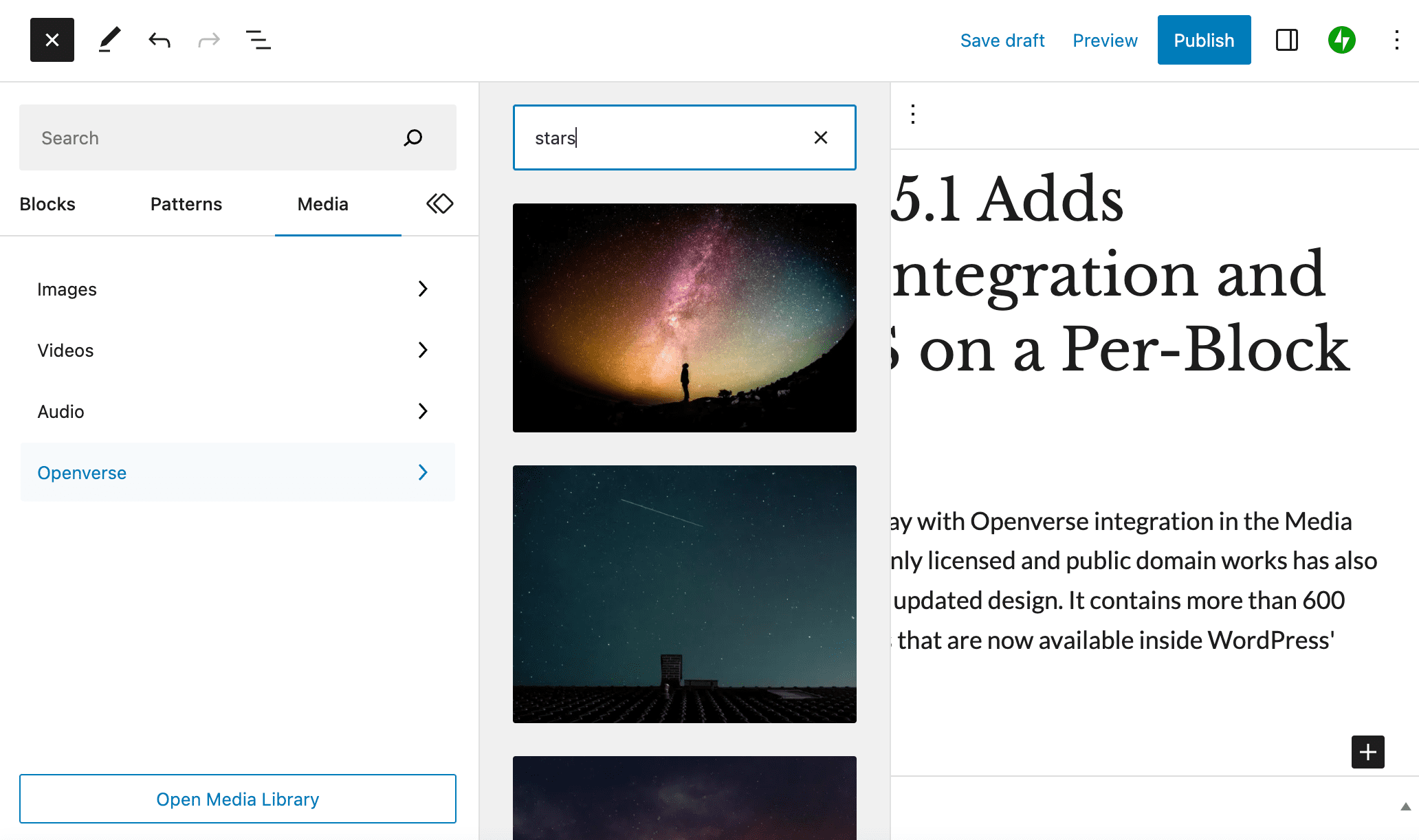 WordPress 6.2 还在这个新的媒体选项卡中添加了与Openverse 的集成。用户现在可以直接在编辑器中访问 Openverse 库,其中包含 700 多部免费使用的公开许可和公共领域作品。单击 Openverse 图像将立即将其作为图像块插入,并自动将适当的属性和许可添加到标题中,这比下载和上传到媒体库要快得多。