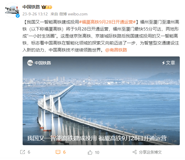 9 月 26 日消息,据中国铁路官方,福州至厦门至漳州高铁(福厦高铁)将于 9 月 28 日开通运营,福州至厦门最快 55 分可达,两地形成“一小时生活圈”。