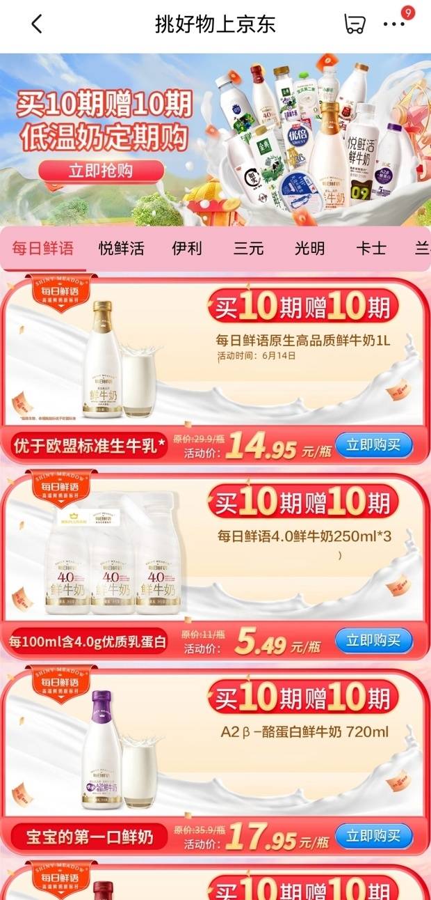 此外,光明致优A2β鲜奶定期购、伊利金典巴氏杀菌乳鲜奶、悦鲜活鲜奶等价格也降至全网最低。