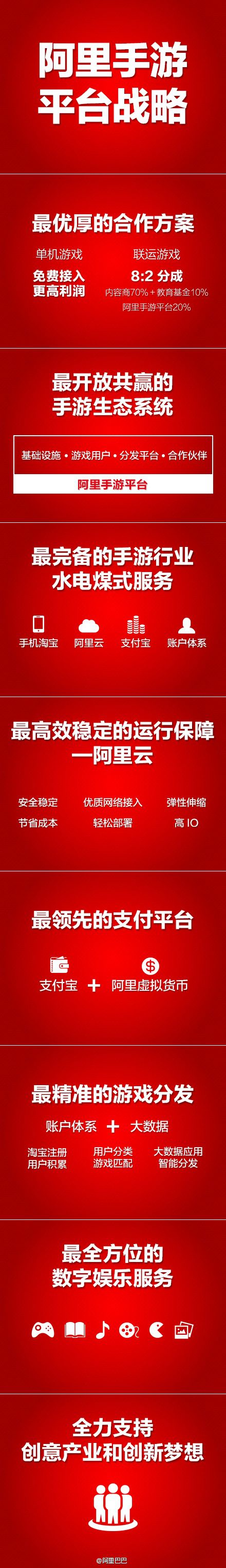 阿里巴巴数娱事业群总裁刘春宁表示,阿里巴巴有着数亿用户,仅手机淘宝平台在2013年的累计用户数就突破了4亿,其中大量的用户都有着游戏方面的需求,这些资源都将会对游戏开发商开放,而阿里云和支付宝等基础服务亦将成为阿里手游平台的共享底层,从而为广大用户和开发者提供统一账户、支付、虚拟货币、大数据统计、阿里云(服务器及带宽托管)等服务,提供一个“方便、易用、安全”的游戏体验环境。
