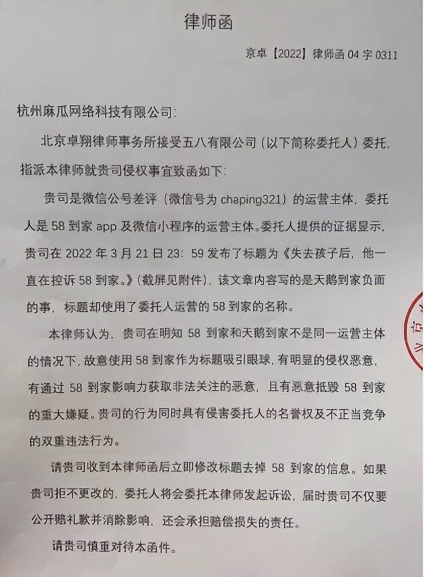 《橡果商业评论》注意到,尽管天鹅到家由58到家改制而来,且官方也大力宣传二者之间的关系,但法律上二者并非一所公司。天鹅到家APP的《用户协议》中显示,其保姆、月嫂服务均由五八到家有限公司提供,而那个宣传中的58到家的运营主体则为北京五八信息技术有限公司。