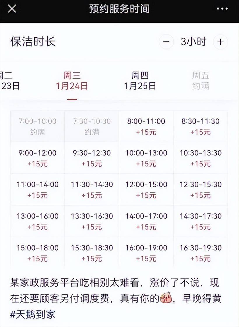 而月嫂业内人士向《橡果商业评论》表示:“有经验好的月嫂,无论在哪个城市都要一万元左右,如果只有7千左右,我觉得有经验的、好的月嫂是不会去做的。”一方面是供给端的高抽成,另一方面,对用户而言,刨去平台连年走高的中介费用外,在热门时段天鹅到家还会收取10-20元的调度费用,只有支付调度费用,用户才能在当天获得相关服务。有用户在社交平台上晒出天鹅到家的预约界面,除早上7:00-10:30的时段被约满外,其余时间均需支付15元调度费。