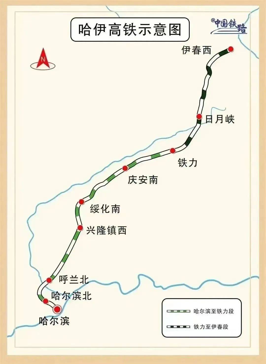 哈伊高铁是我国在建纬度最高、全线所处地区全年温差最大、首条穿越多年岛状冻土区的高速铁路,起自黑龙江省哈尔滨市,途经绥化市,终至伊春市,正线全长 318km,设计时速 250km。IT之家附官方示意图如下: