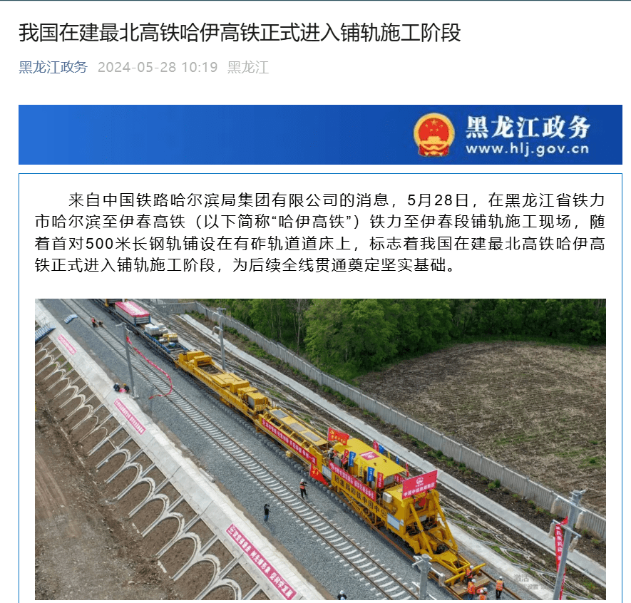 IT之家 5 月 28 日消息,据哈尔滨交通广播消息,5 月 28 日,在黑龙江省哈尔滨至伊春高铁(下称“哈伊高铁”)铁力至伊春段铺轨施工现场,随着首对 500 米长钢轨铺设在有砟轨道道床上,标志着我国在建最北端高铁哈伊高铁正式进入铺轨施工阶段,为后续全线贯通奠定坚实基础。