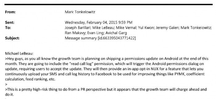 这些电子邮件显示,Facebook的增长团队希望调用这些日志数据来改善Facebook的算法,并通过“你可能知道的人”功能来吸纳更多用户。值得注意的是,项目经理认为“从公关角度来说,这是一个风险非常高的事情”,但这种高风险似乎已经被潜在的用户增长所忽视。