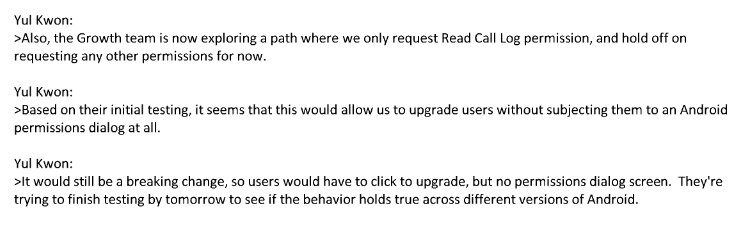 起初,通常以应用内弹出对话框的方式要求用户选择加入。不过在者尝试探索各种方式来让用户注册的过程中,很明显利用Android的数据权限来自动注册新用户。在另一个邮件链中,开发该功能的小组将Android权限屏幕的作为不必要的摩擦点,并尽可能的避免。当测试过程中发现调用日志可以在没有权限对话框的情况下进行,开发人员随后就大肆利用这种方式收集用户信息。