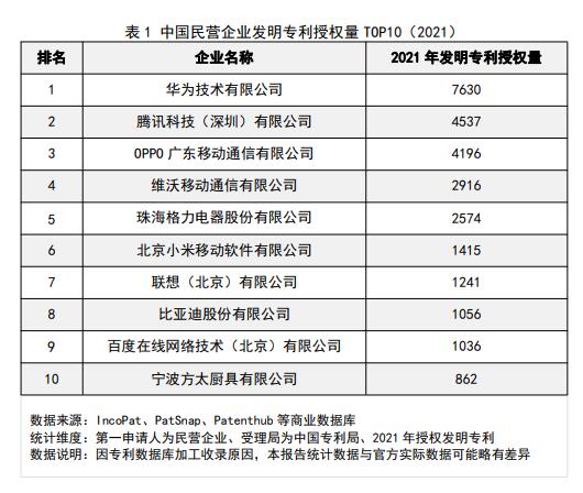 近日,国家知识产权局知识产权发展研究中心发布《中国民营企业发明专利授权量报告(2021)》。