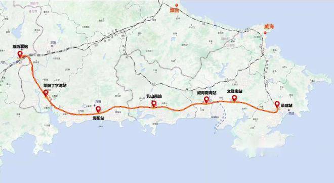 莱荣铁路西端起自潍莱铁路莱西站,东与青荣城际荣成站接轨,设计速度350km/h。
