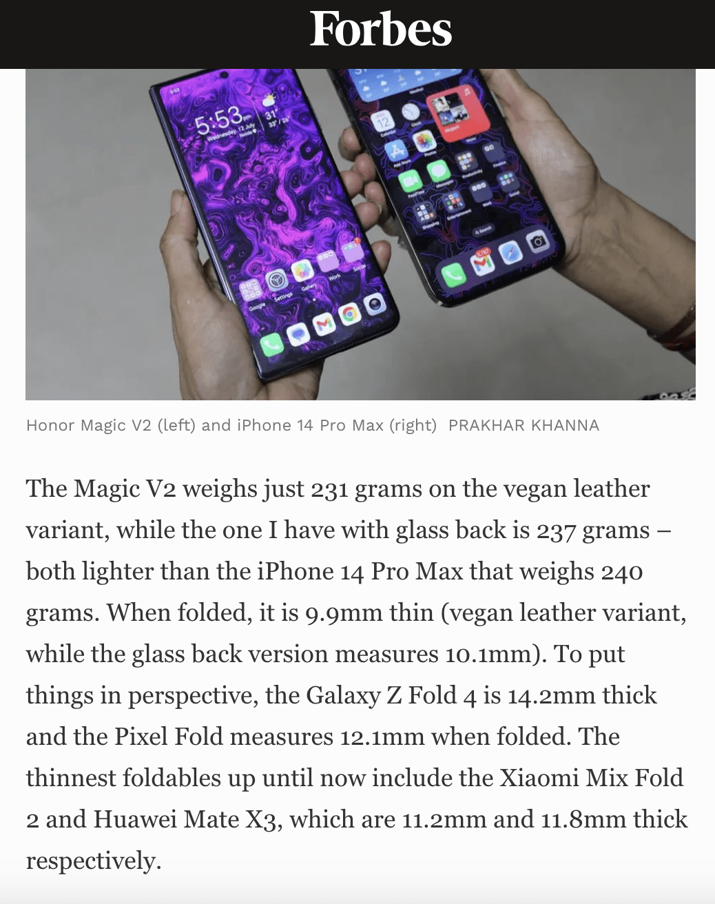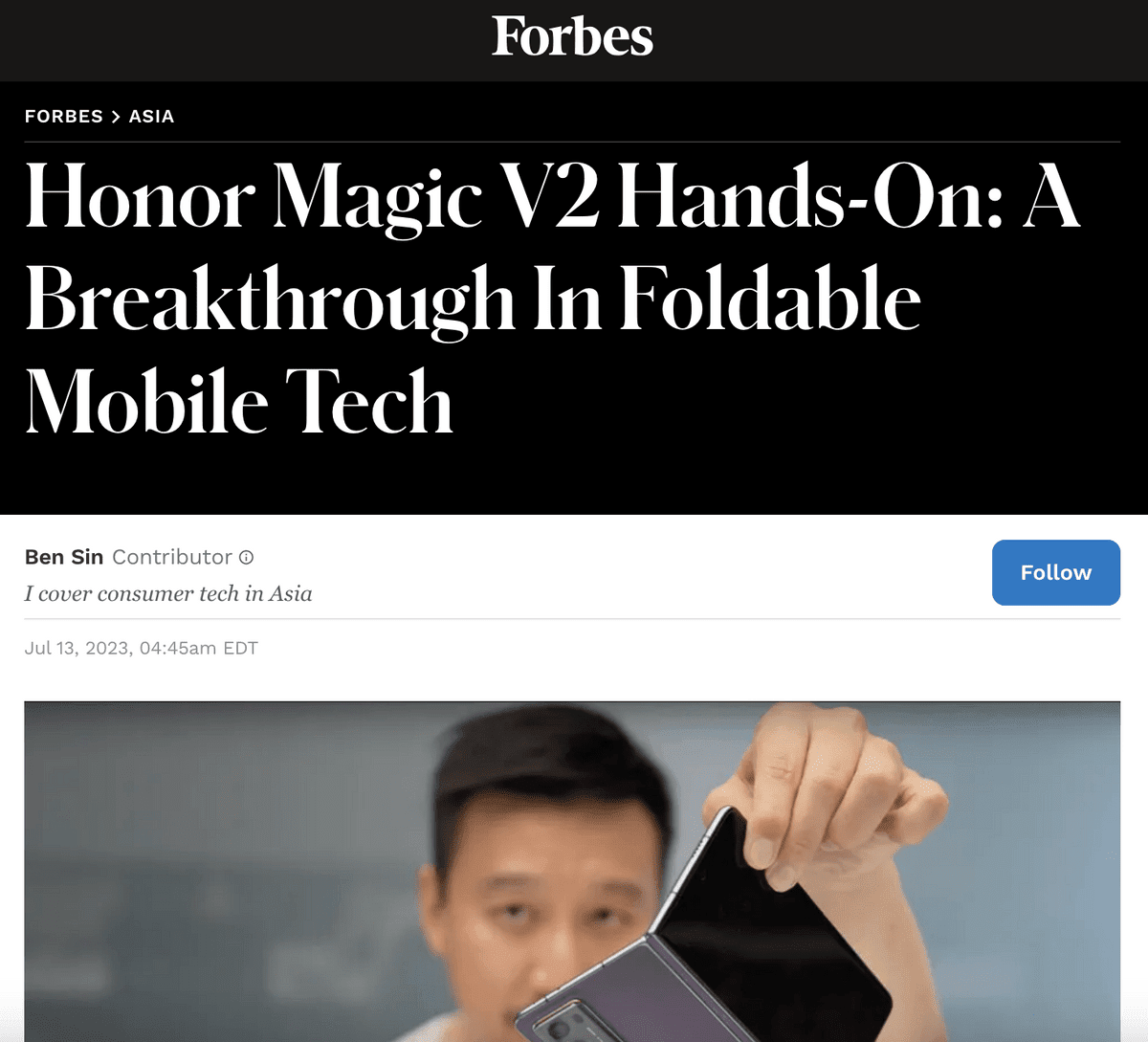 值得一提的是,美国最早的大型商业杂志、全球最为著名的财经出版物之一的《福布斯》(Forbes)也派出曾经在纽约时报,华尔街日报等机构工作,有丰富的科技行业报道经验的Ben Sin来做此次关于荣耀Magic V2系列的报道。并且在产品发布后,《福布斯》也对荣耀Magic V2系列做出了极高评价。