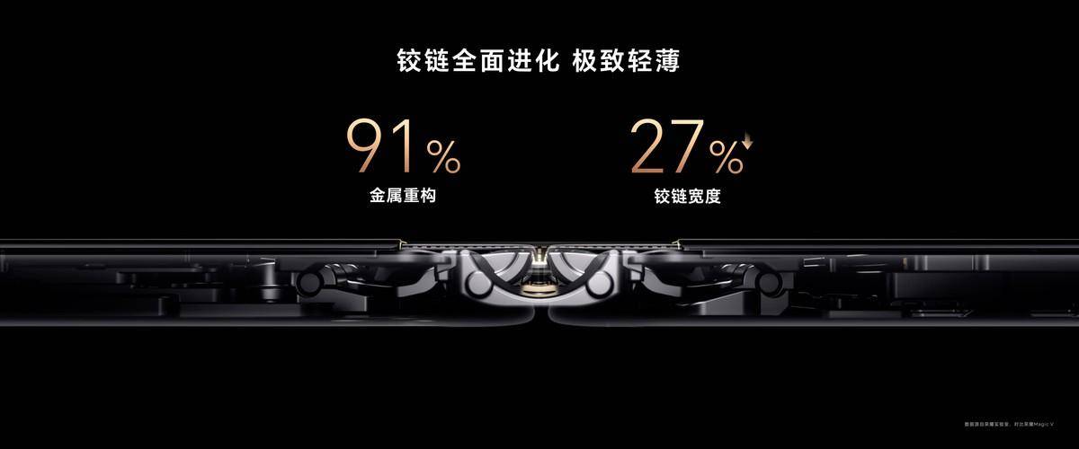 值得一提的是,材料上的更新,也让其在轻薄的同时,保证了足够强度。荣耀Magic V2系列是行业首次将钛金材质加入到轴盖当中,并应用在相对脆弱的中轴部分,除了在铰链的轴盖部分使用了钛合金,荣耀Magic V2系列还在铰链主体部分大量采用全新荣耀自研盾构钢。出色的抗造能力也获得了全球权威机构SGS的SGS高可靠折叠品质金标认证,即便每天折叠100次,也能保证使用10年以上完全无后顾之忧。