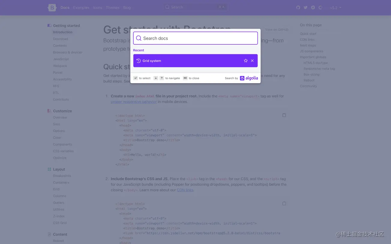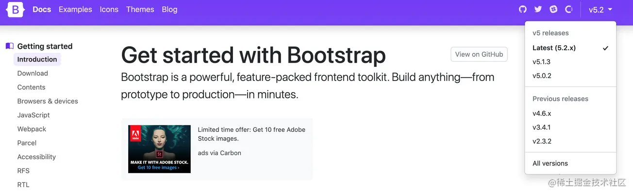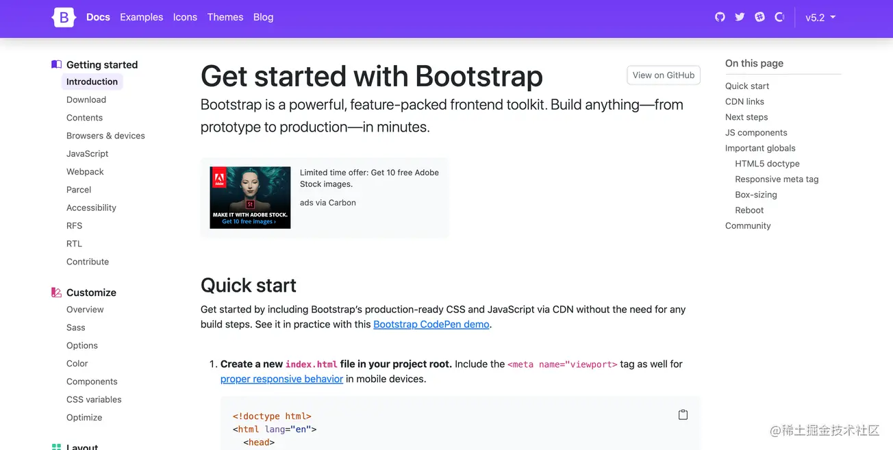 进入文档主页,可以看到发生了很多的变化。在导航栏,与之前相比,发现取消了子导航,并添加了侧边栏以便快速定位每个页面,以提高发现性。 它现在是通过 CDN 使用 Bootstrap 的分步指导指南。