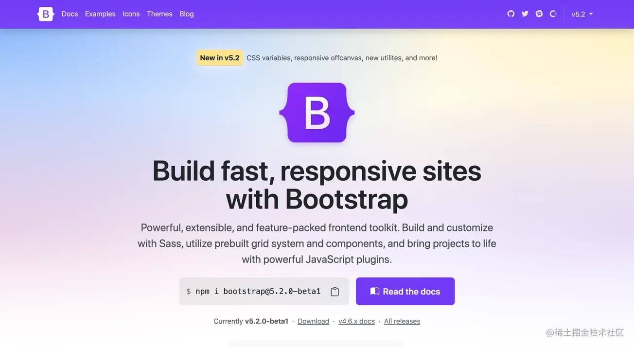 Bootstrap 5.2.0 beta 现已发布,这是v5版本以来最大的一次发布更新。这个版本的特点是重新设计了文档、所有组件的CSS变量、响应式的offcanvas、新的helpers和utilities、改进的按钮和输入框样式,以及许多底层的改进。