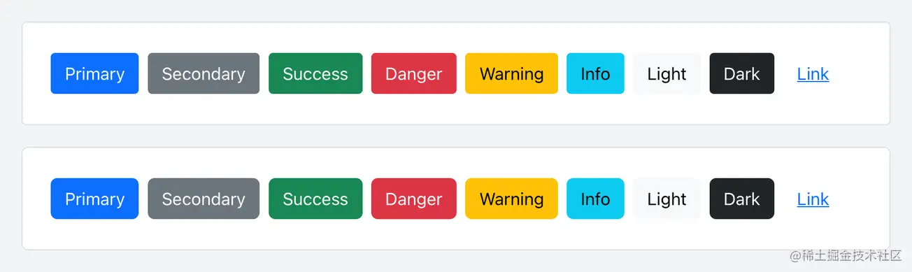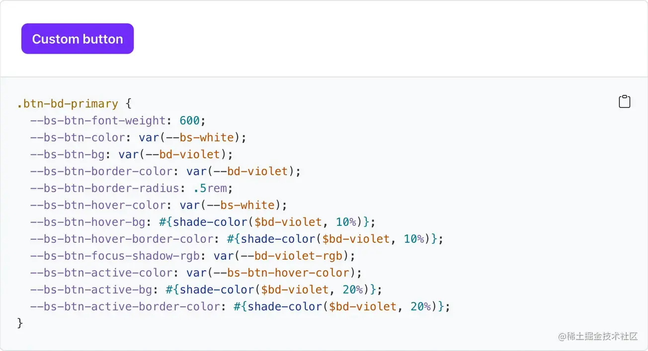 在此版本中,所有的组件都包含CSS变量,以实现实时自定义、更轻松的主题化以及(很快)从暗模式开始的颜色模式支持。每个组件页面都已更新,包括相关CSS变量的参考指南。以buttons 为例子: