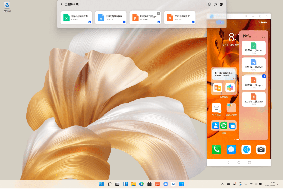 华为 MateBookX Pro 2022堪称年会总结场景下的痛点终结者。手机顶部下滑,在超级终端界面,一拉即合,瞬间实现多设备协同,手机应用在PC屏上的窗口支持大窗口显示,最多支持“2个横屏大窗口 + 1个竖屏主窗口”,显示体验近似“PC窗口”,PC端的交互操作体验更加舒适自然、流畅高效。多屏协同大窗口,看似只是小功能的优化,实则是用户实际体验的重大提升,让应用在每一端都有最佳使用体验。
