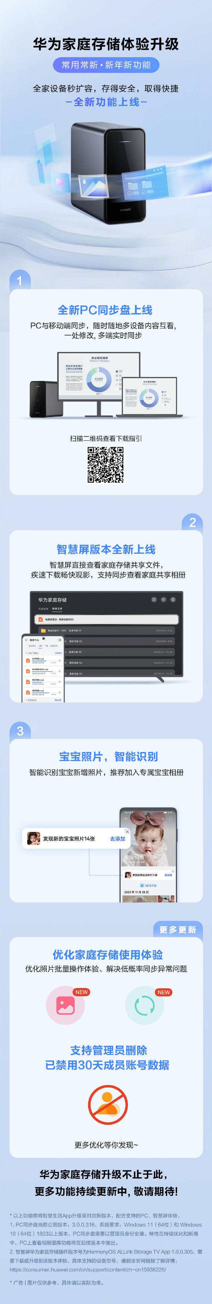 2 月 16 日消息,华为官方宣布,华为家庭存储迎来升级,全新 PC 同步盘上线、智慧屏疾速下载畅快观影、新增智能识别宝宝照片等等。
