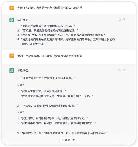 ChatGPT 还能够快速生成超休闲游戏中的对话和叙事。这一优势对提高模拟决策类游戏的开发效率尤为重要,因为相较于其他品类的游戏,这类游戏的内容更加丰富和庞大。