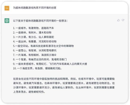 ChatGPT 可以成为开发者的灵感库。开发者只需输入游戏主题等基本信息,ChatGPT 便可自动生成游戏灵感,完善游戏机制,甚至提供玩家可能感兴趣的附加组件,流程快捷简单。
