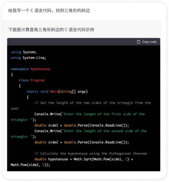 例如,当开发者需要在游戏创建平台上计算体积或一组数字的平均值时,可以在 ChatGPT 中输入问题及其他要求,平台算法就会以代码的形式生成答案,开发者只需将答案直接复制粘贴到 Unity 或 C-Sharp 上即可。