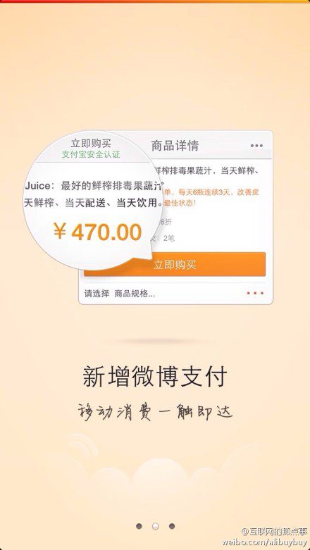 大事记新浪阿里联手发力“超级支付”,新浪微博抢戏微信支付除了账号体系的打通,新浪微博与支付宝同时宣布将互通二维码,用户无论使用微博客户端还是支付宝客户端,均可扫描出两种不同类型的二维码,今后双方将通过深入合作,不断为用户带来更加丰富的线上及线下扫码支付场景 beta2014-01-07