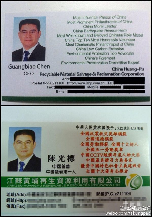 精彩文章陈光标英文名片闪瞎美国记者陈光标发给美国记者名片上的众多头衔,美国媒体直呼不可思),中国最具影响力的人、中国最杰出的慈善家、中国慈善界的领袖、中国地震救援英雄、中国最有名最被热爱的模范人物、中国最具魅力的慈善家 beta2014-01-08