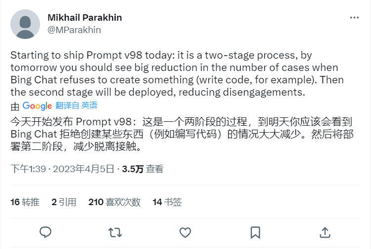 Bing Chat v98 的发布将分两个阶段进行。根据 Parakhin 的说法,第一阶段的设计目的是大幅减少“必应聊天拒绝创建内容”的情况,例如编写代码。第二阶段将会将减少聊天机器人出现脱离的情况。
