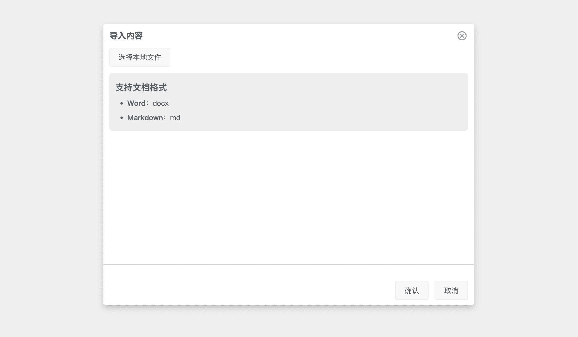 富文本支持文档一键导入,支持 Word 文档(docx)、Markdown 文档(md)